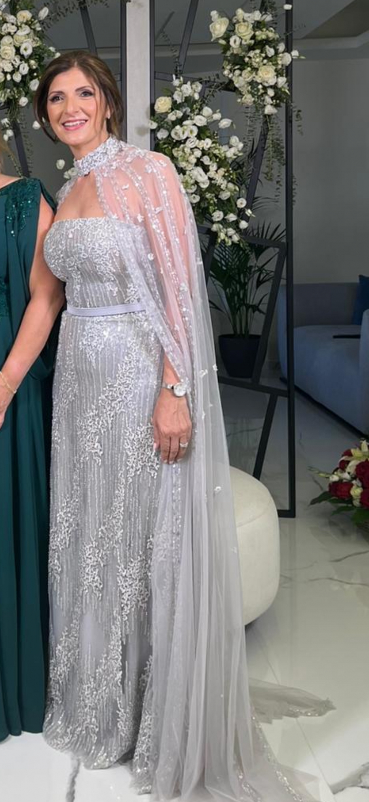 #1194 – strapless embroidered straight cut with shoulder cap beaded in silver