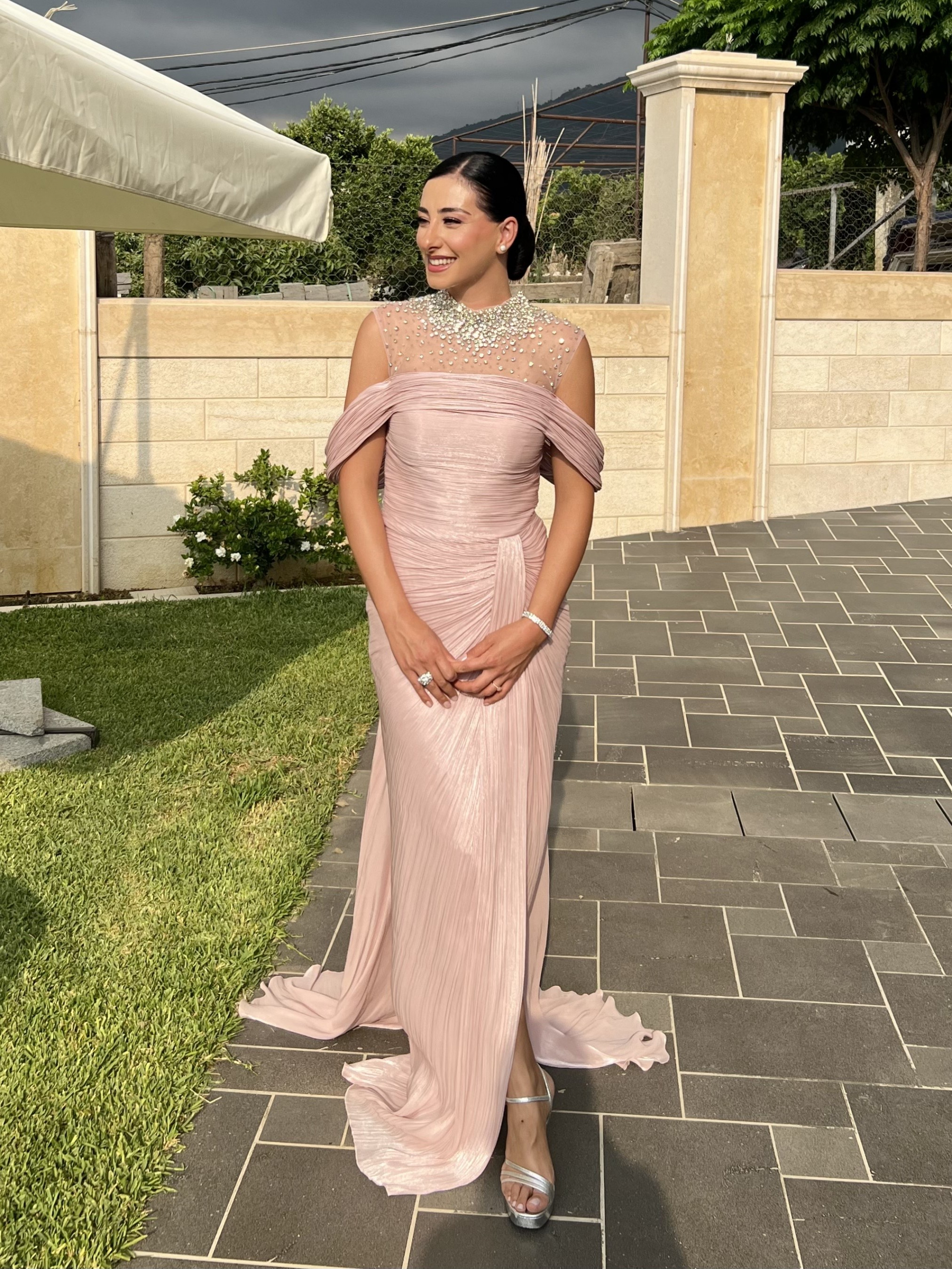 #1146 – Off shoulders pleated organza with neck strass detail in nude pink