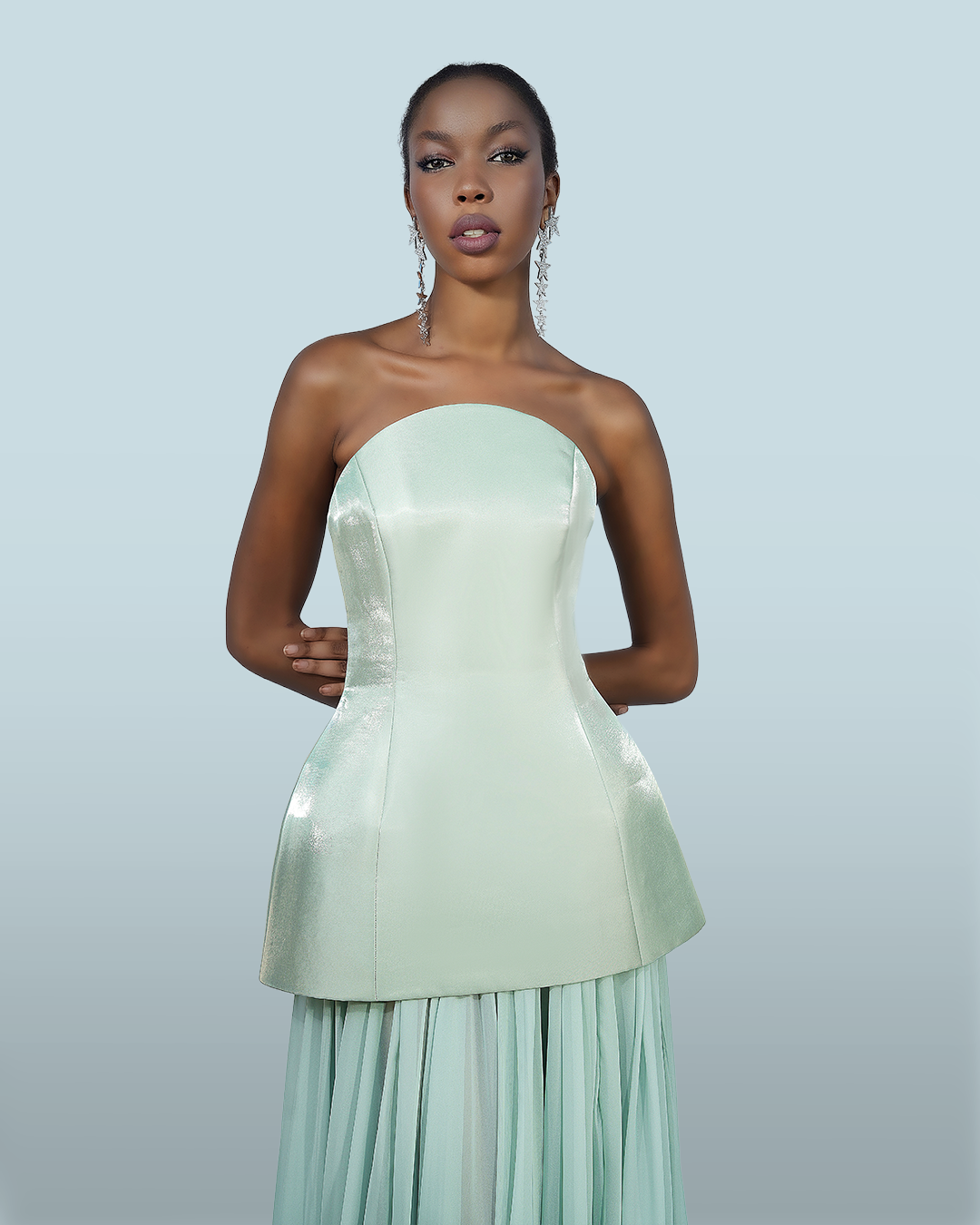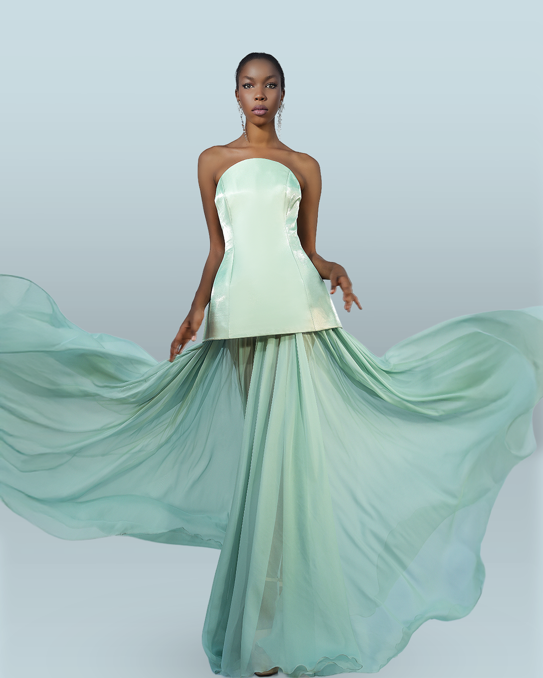 #1201 – Strapless round neckline corset with under skirt mousseline in mint green