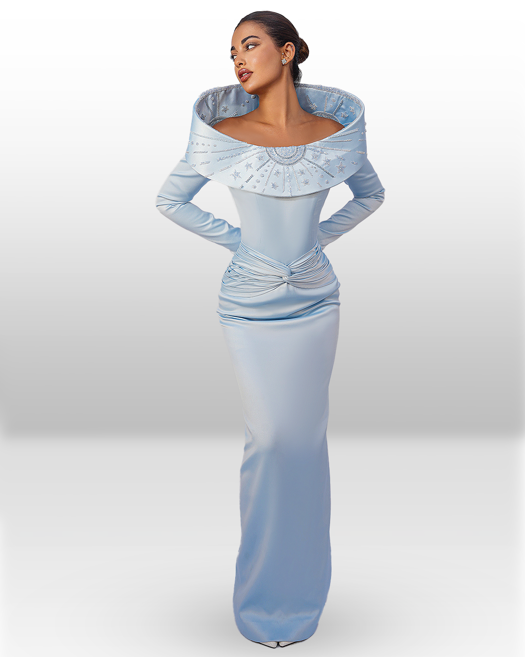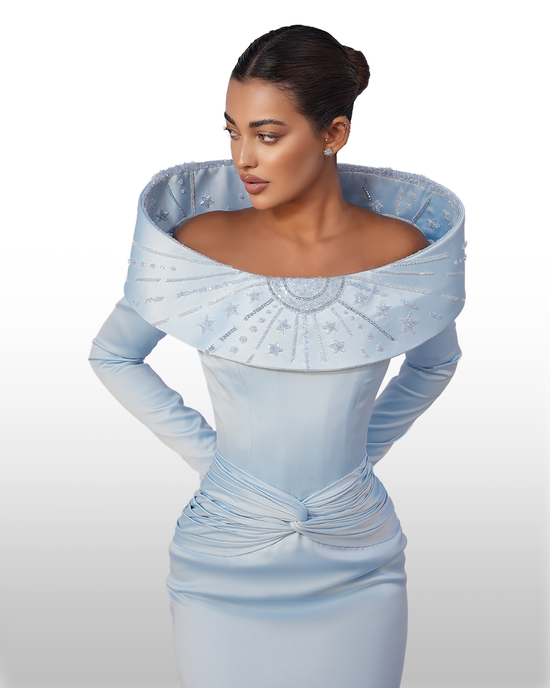 #1200 – Off shoulders long sleeves straight satin cut with neck statement in blue
